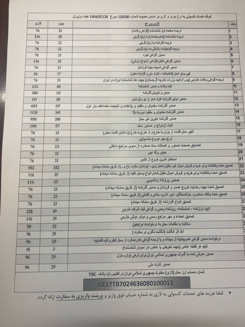 به اطلاع هموطنان گرامی می رساند: طبق جدول فوق الذکروبراساس تصویب نامه هیات محترم وزیران به شماره ۱۲۰۲۸۰ مورخ ۱۴۰۴/۰۷/۲۶، تعرفه خدمات کنسولی تغییر یافته است و خدمات کنسولی من بعد با نرخ جدید محاسبه و اعمال میگردد. لذا در مراجعه به بخش کنسولی و قبل از واریز هر وجهی از تعرفه جدید اطمینان حاصل نموده، سپس برابر نرخ های مصوب جدید اقدام به واریز وجه نمایید .